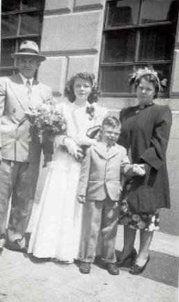 | My mom (Judy), age thirteen, on her confirmation day. Her parents (Ma and Pa) on either side, and Roy doing his best to make an awful face and spoil the photo. |